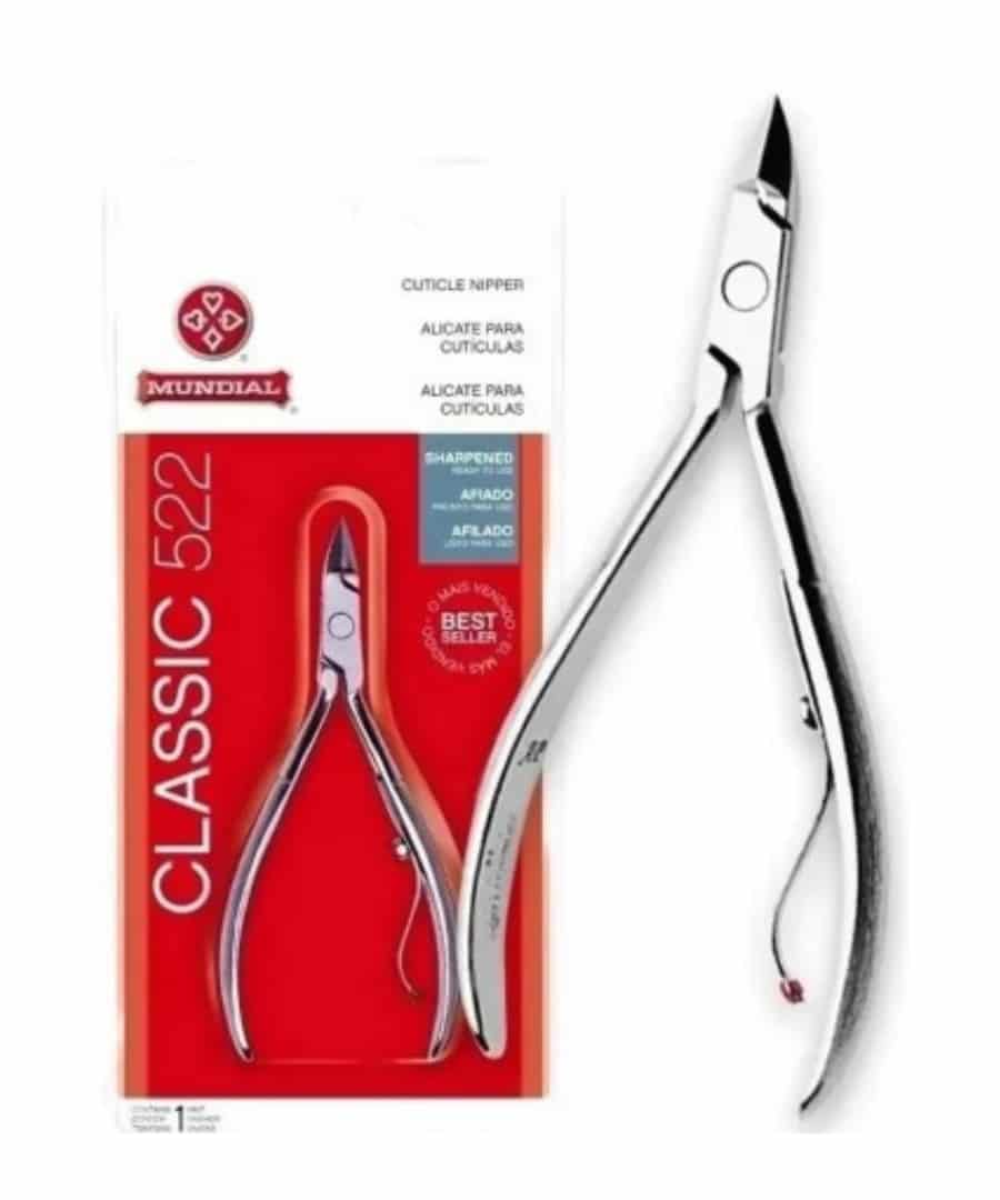 Alicate de Cutícula Mundial com mola resistente e com redutor de atrito, cabo texturizado impedindo o deslizamento e oferecendo maior segurança ao manuseio, aço carbono niquelado, esterilizável em estufa, lâminas afiadas, corte preciso e alta durabilidade.
