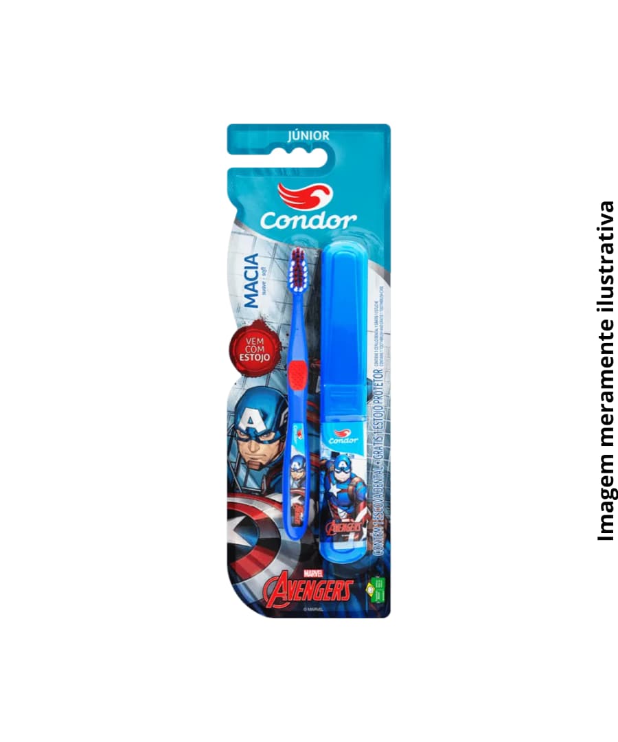 Kit Dental Condor Júnior Vingadores, escova desenvolvida para promover uma escovação eficiente e segura para crianças. Possui cerdas macias que limpam suavemente sem agredir a gengiva, além de cabeça compacta, ideal para bocas pequenas. Produto com apelo visual atrativo, favorecendo o incentivo à higiene bucal desde cedo. Acompanha estojo protetor de cerdas, ideal para transporte e conservação da escova. Idade : 6 anos +.