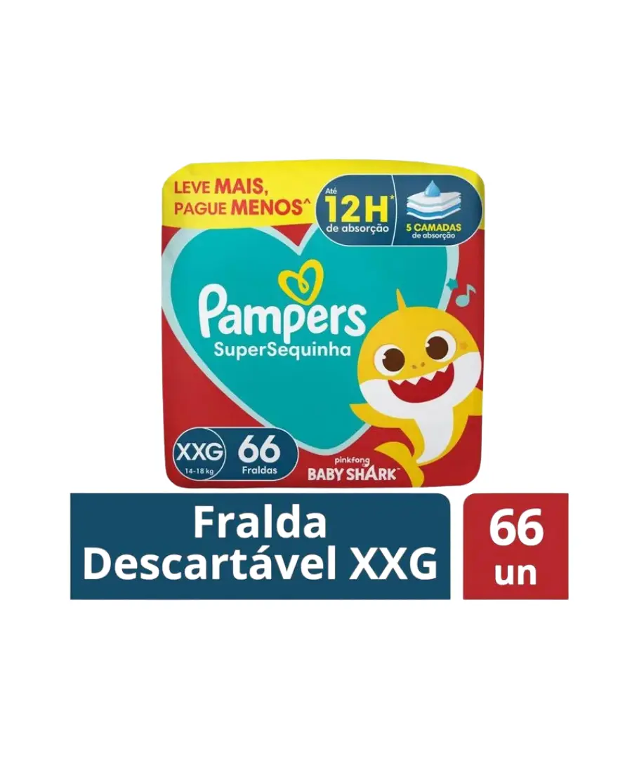 A fralda descartável Pampers SuperSequinha com desenhos divertidos de Baby Shark mantém seu bebê seco e protegido por até 12 horas graças às suas 5 camadas de absorção reforçada. Também tem uma maior área de absorção que ajuda a evitar vazamentos. Mantenha seu bebê super sequinho a um super preço com Pampers SuperSequinha. Indicada para uso tanto diurno, quanto noturno, no pacote com fraldas tamanho XXG, contém 66 unidades e que suportam bebês de 14 a 18kg. As fitas reajustáveis, que grudam e desgrudam, permitem que você ajuste o quanto precisar, sem danificar a fralda. O gel superabsorvente absorve e retém a umidade dentro da fralda.