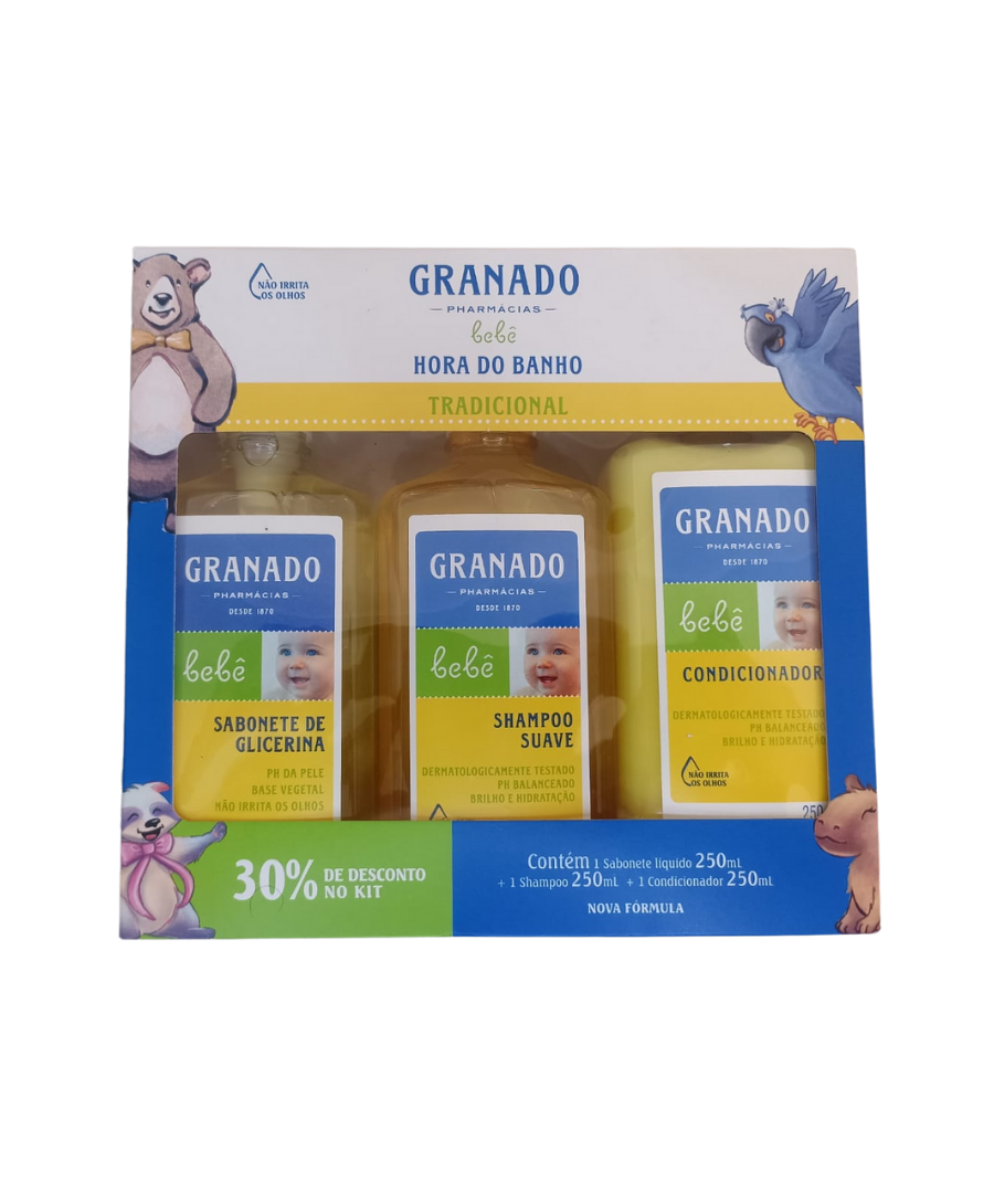 O Kit Granado Hora do Banho Tradicional é um conjunto completo de cuidados para a higiene diária do bebê, composto por três produtos essenciais: Sabonete Líquido de Glicerina 250ml, Shampoo 250ml e Condicionador 250ml. Todos os produtos são desenvolvidos com fórmulas suaves, hipoalergênicas e com base vegetal, respeitando a sensibilidade da pele e do couro cabeludo dos pequenos desde os primeiros dias de vida.
