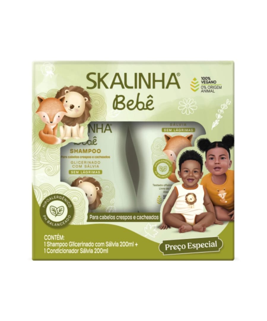 O Kit Skalinha Bebê, composta por Shampoo Glicerinado e Condicionador com Sálvia, oferece cuidado especial para os cabelos crespos e cacheados dos pequenos. Ambos os produtos são livres de substâncias nocivas como sal, sulfato, parabenos, petrolato, óleo mineral e corantes. Com suas fórmulas hipoalergênicas e ingredientes naturais, incluindo glicerina vegetal, garantem uma limpeza delicada e um desembaraço suave sem irritar a pele ou os olhos. Os cabelos ficam macios, sedosos e brilhantes após o uso.