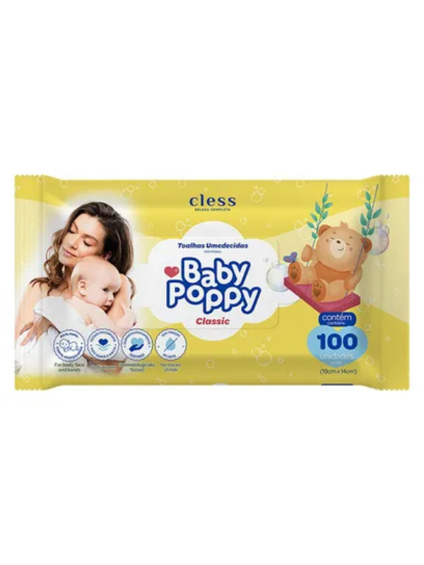 Toalha Umedecida Aloe Vera Baby Poppy Premium 19cm x 14cm Pacote 100 Unidades